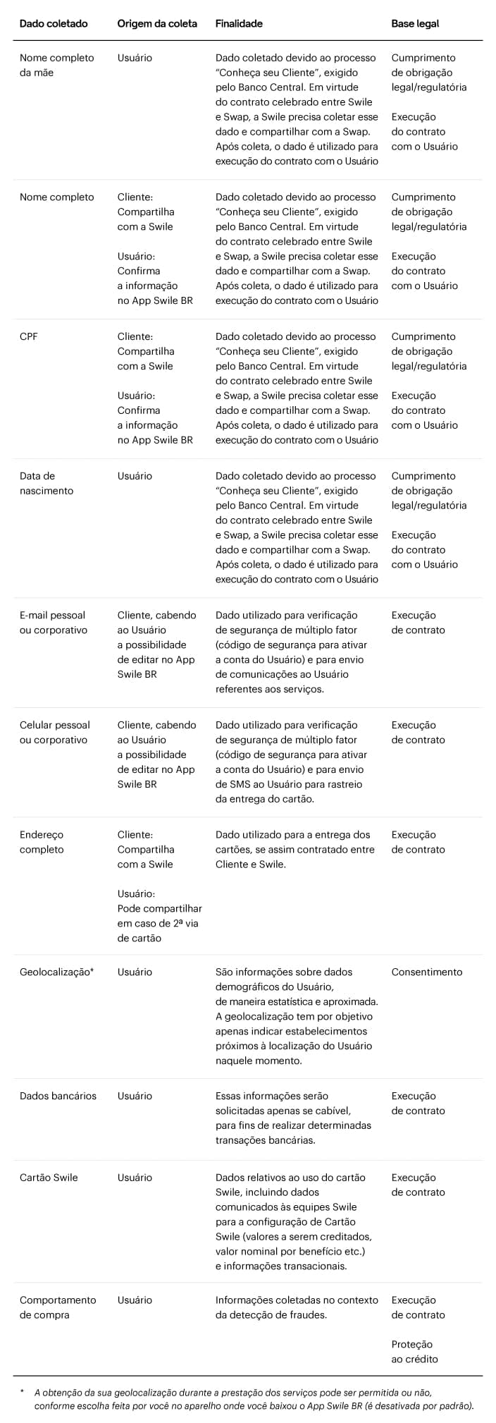 A Swile coleta e trata os Dados Pessoais relativos aos Usuários. Estes dados podem ser obtidos diretamente dos Usuários ou podem ter sido coletados de maneira indireta, através dos Clientes da Swile, Parceiros Credenciados ou terceiros envolvidos nas operações de tratamento (instituições financeiras, plataforma de serviços de terceiros, estabelecimentos que aceitam o Cartão Swile ou o App Swile BR, dentre outros). Os dados dos Usuários são tratados pela Swile de acordo com as finalidades para as quais foram coletados e em conformidade com a legislação aplicável.