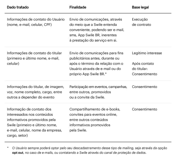 De maneira mais específica, com relação às atividades de marketing, a Swile se pauta nas seguintes bases legais, a depender da atividade que executará:
